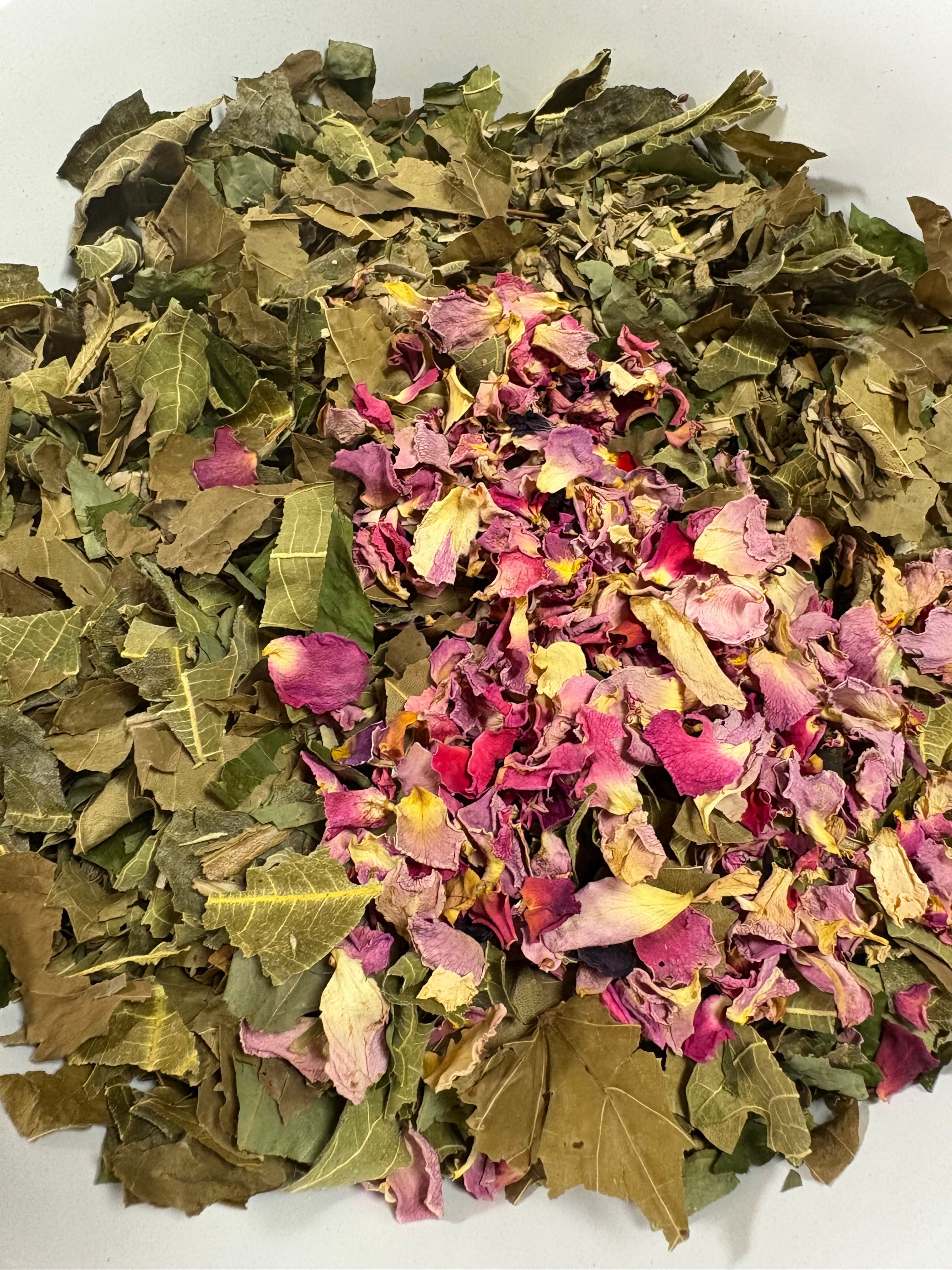 ブレンド内容:オリーブリーフ/クロモジ(山梨)/グレープリーフ(山梨)/イチジクリーフ(山梨)/ローズ(千葉/モロッコ)